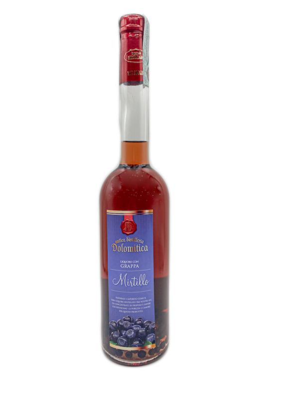 Grappa di vinaccia e mirtilli sono gli ingredienti di questo liquore di grappa dal colore intenso da servire a una temperatura tra gli 8° e i 14°. L’aroma intenso del liquore di grappa di Mirtillo dell’Antica Distilleria Dolomitica ricorda un cestino di mirtilli freschi e succosi frutti di bosco.
